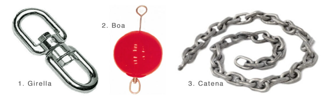 Ovvio che comunque un certo logorio delle maglie, seppur minore, lo subisce anche il tratto di catena verticale che dal fondo arriva in boa. Ecco quindi rendersi indispensabile e raccomandabile un attento e programmato controllo da parte di un operatore subacqueo, con l’occhio esperto, in particolare anche di quel tratto di catena oltre che della girella.